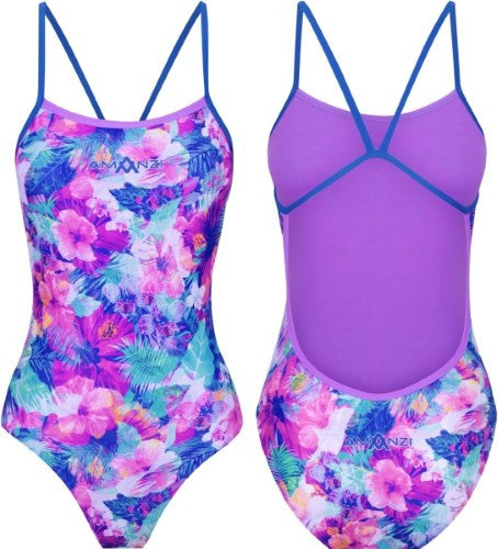 The Amanzi Wild Blooms one piece has an exotic print featuring wild tropical flowers with palm fronds, stylized into a beautiful collage in shades of blue and purple. The intricate design captures the lushness and vibrancy of the tropics, with each individual flower and frond carefully crafted to create a visually stunning composition. The blue and purple hues add depth and dimension to the print, making it a truly eye-catching piece that is sure to make a bold statement at the pool.
