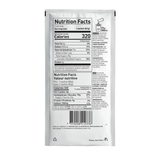 Studies have shown that our bodies can make use of up to 90 grams of carbohydrates per hour. One DRINK MIX 320 CAF 100 sachet, mixed with 500 ml of water contains 80 grams of carbohydrates.