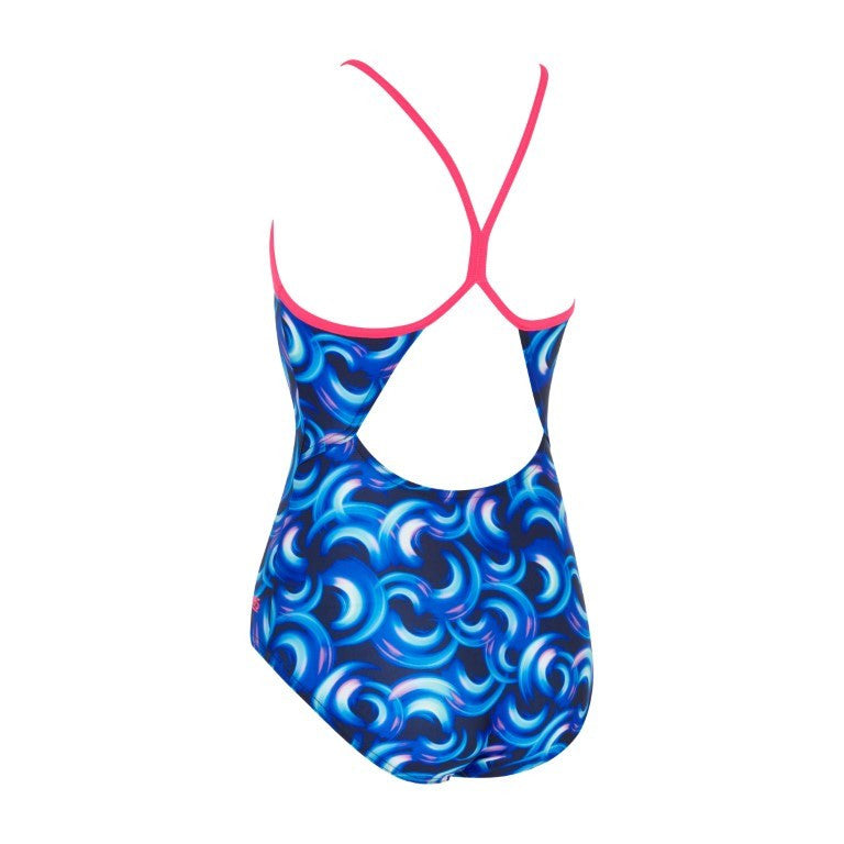 Make a splash in style with Zoggs Geo Spiral Sprintback! Your junior girl will love the blue swirl design with contrasting pink straps.