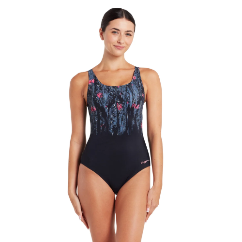 The vibrant print design pops on the black base. Featuring adjustable straps for the perfect fit, a classic scoopback, mesh tummy control, wide straps for support and full foam cups.