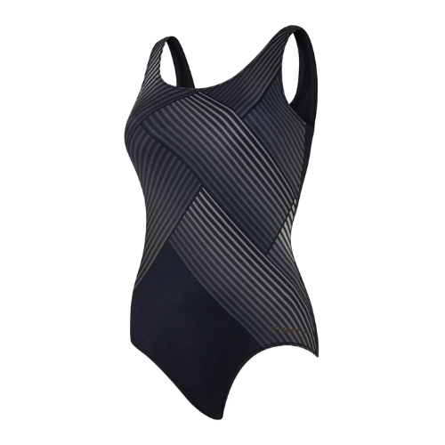 Dive into elegance with Zoggs Seafarer Scoopback. The timeless striped placement print is designed to flatter and add a touch of sophistication to this classic black suit.