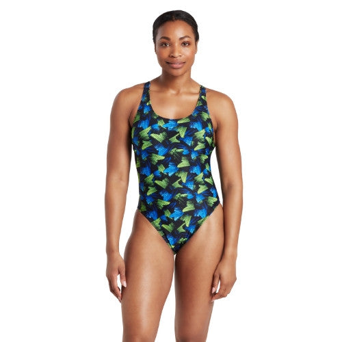 Elevate your swim training with Swell Masterback! The summer Swell design features a black base with blue and green accents. The open back and wider straps create a perfect combination of freedom of movement and support. The high leg height on this one piece swimsuit is perfect for the fast lane swimmer to allow easier leg movement.